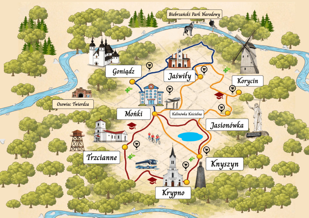 Projekt obejmuje gminy: Mońki, Knyszyn, Krypno, Jaświły, Jasionówka, Goniądz oraz Trzcianne, a także powiat moniecki.