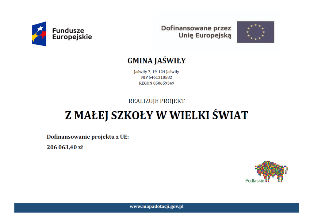 Projekt realizowany jest przez Gminę Jaświły we współpracy ze szkołą, dofinansowany z Funduszy Europejskich dla Podlaskiego 2021–2027 w kwocie 206 063,40 zł.